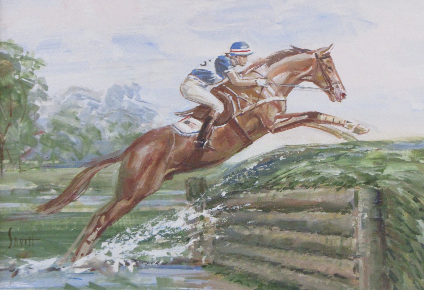 This dynamic painting in gouache has a double mat (white with blue inset), which measures 22 by 17.5 inches. The horse and rider represent the United States Equestrian Team. (sold)