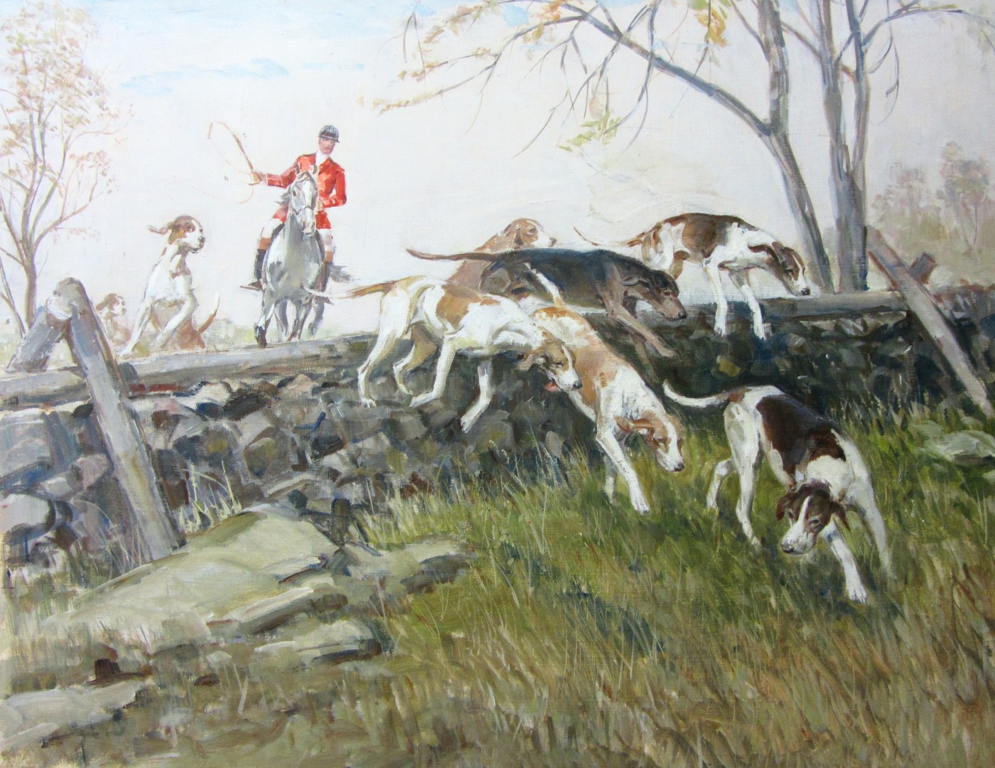 This large, exquisite oil painting on fox hunting captures a moment of hot pursuit. This painting is on a board measuring 20 by 25 inches and is nether framed nor matted. Price: $3,950. (SOLD)