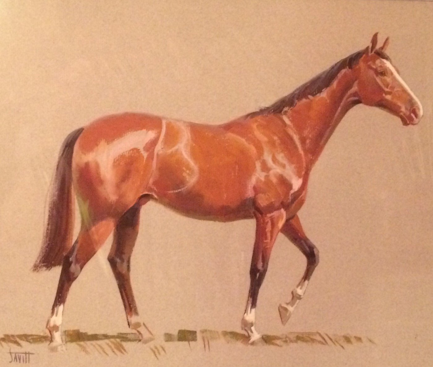This portrait of a bay horse is a watercolor painted on brown paper with a very subtle blueish texture. Including a dark brown mat, this is a large piece, measuring 18 by 20 inches. Price: $675. (SOLD)