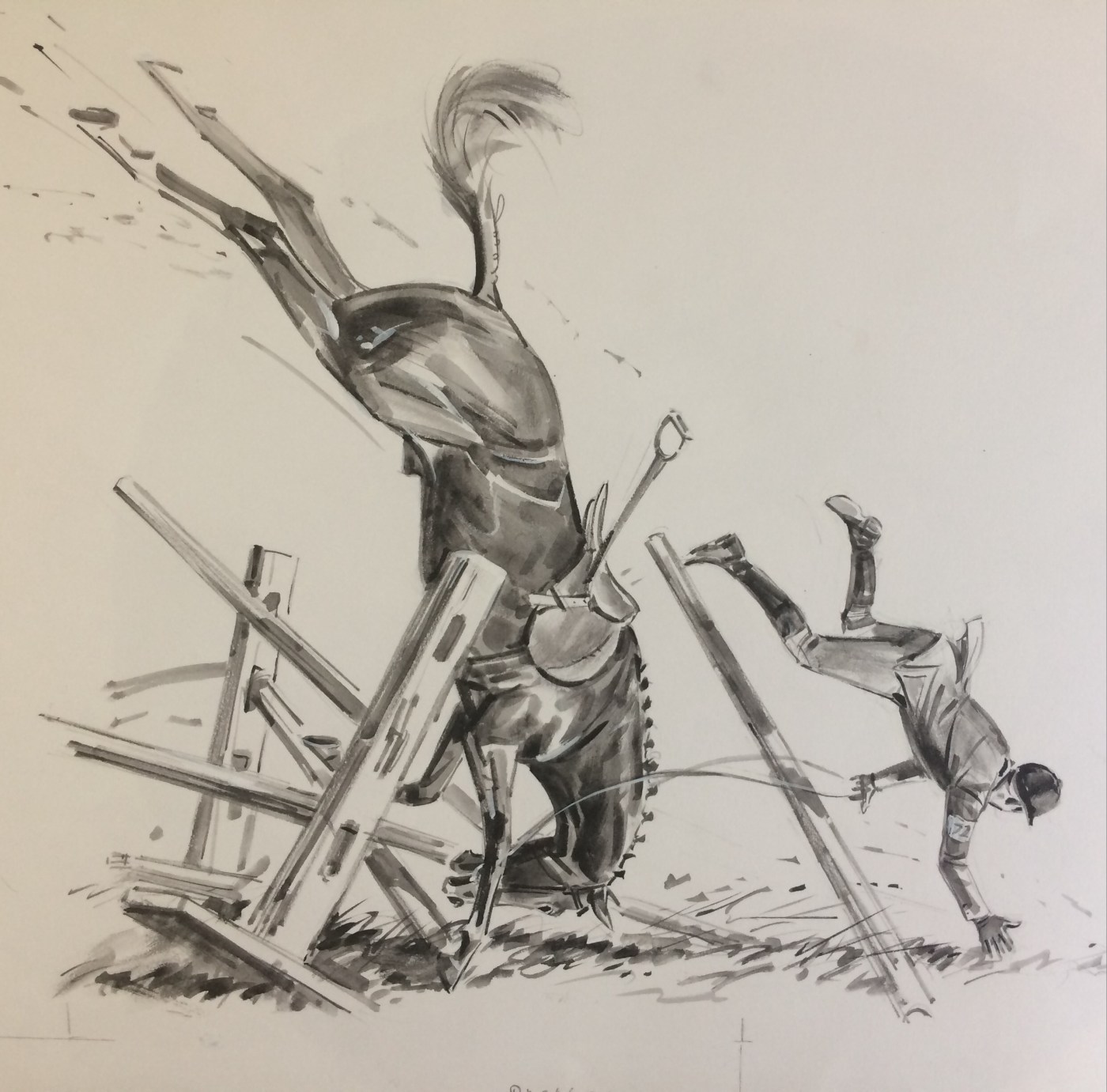 From the book “Dingle Ridge Fox and Other Stories” (pg 66) the story called “Paragon” shows a jump badly taken. This is a watercolor on paper, measuring 12 inches square.