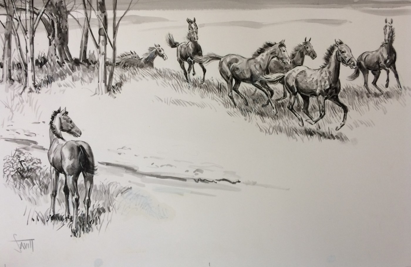 This pleasing rendition of horses galloping across a field is all the more effective because of its straightforward simplicity in black and white watercolor. This piece from the 1980s is unframed and measures 16 by 20 inches. Price: $1,500. (SOLD)