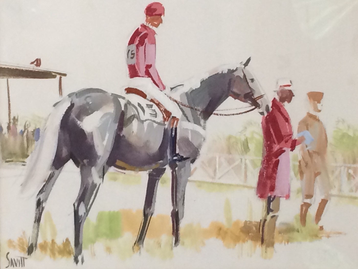 This watercolor, that evokes an impressionist style, is a wonderful snapshot of the minutes before a horse race. This piece measures 7 by 9 inches without a mat or frame. Price: $950.