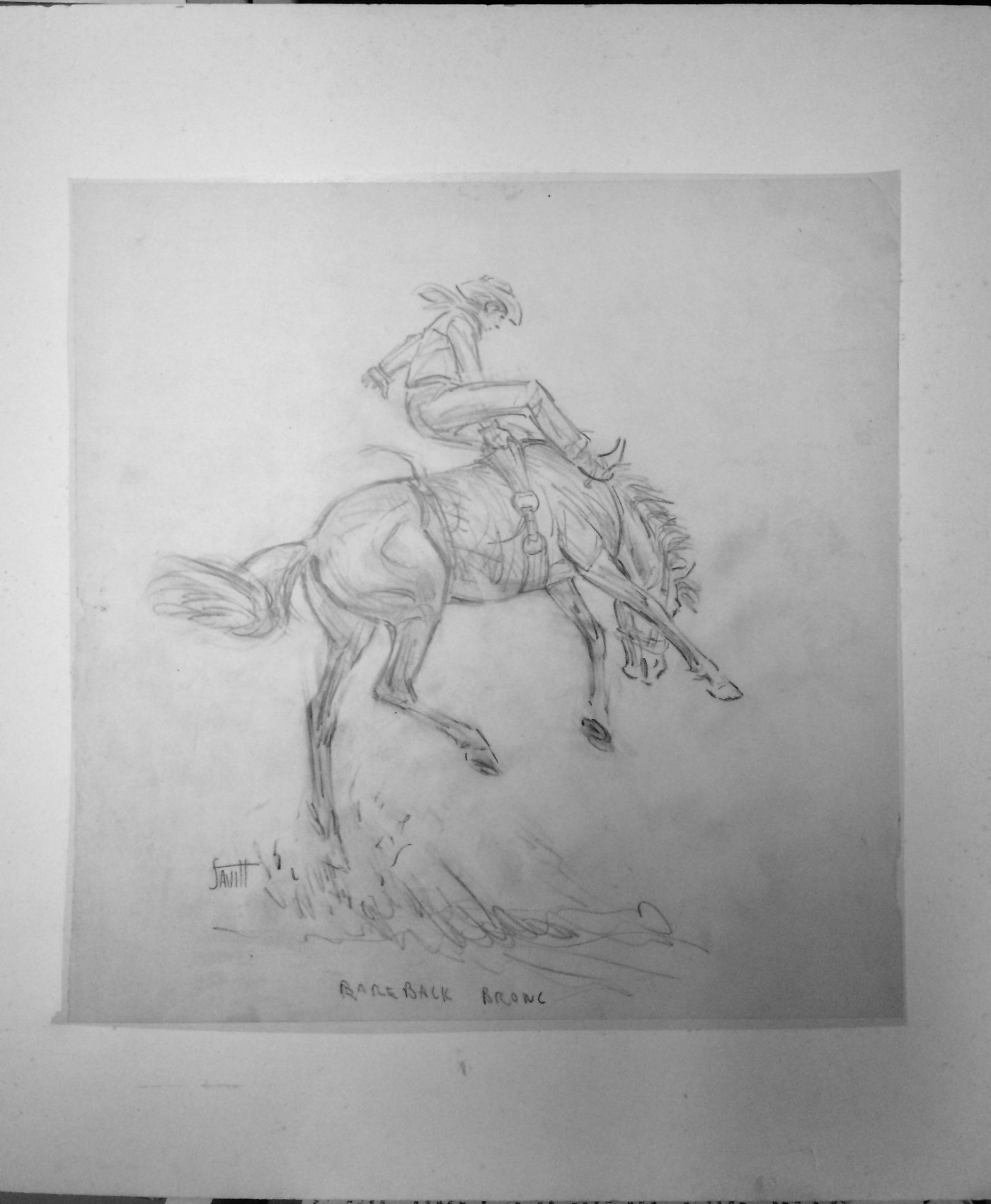 This pencil drawing, which measures 14 inches square, is a rough sketch executed on light paper, which has been affixed to foam board. I rate the condition of the drawing as “fair,” but it is a very good representation of Sam Savitt’s ability to capture the horse in motion. The words at the bottom of the page, “bareback bronc” are his notes. Price $100.