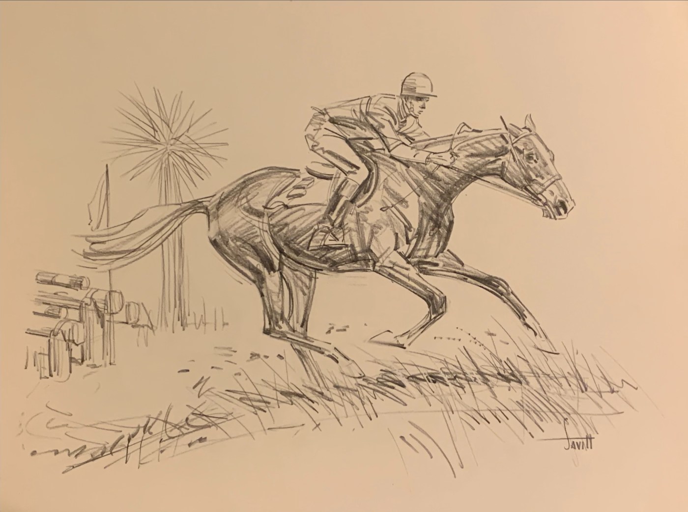 Sam Savitt frequently did multiple copies of the same scene, with each a little more detailed and with slight adjustments as he saw fit. This is the final version of a rider running a cross-country course. This drawing on medium-weight paper measures 13 by 17 inches. It has no mat. (SOLD)