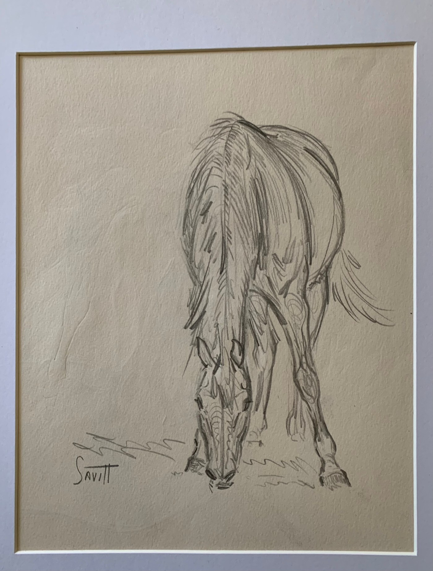 This pleasing and simple drawing shows Savitt’s talent for rendering the horse from an angle that would be difficult for many artists. This original drawing on paper measures 7 by 9 inches. Price: $275. (SOLD)