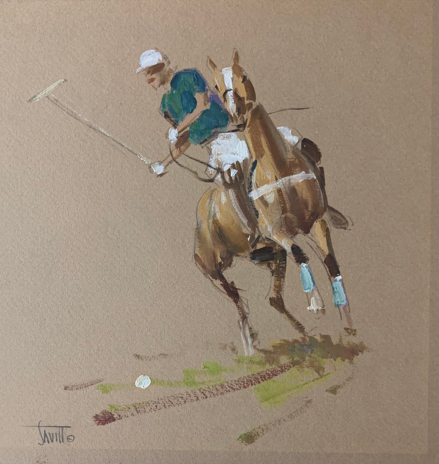 This quick original painting in gouache shows a polo player in action. It was painted on paper affixed to foamboard and is probably about 50 years old. It measure 7 by 7 inches. Price: $125. (SOLD)
