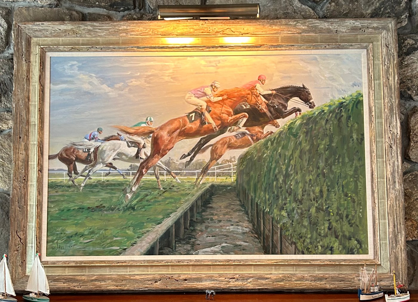 This masterwork by Sam Savitt that captures the thrill of a steeplechase event has been duplicated many times, but this is the original oil painting. It is large, with an image measuring 48 by 32 inches, plus a handsome frame. Price: $15,000. (SOLD) 1/25