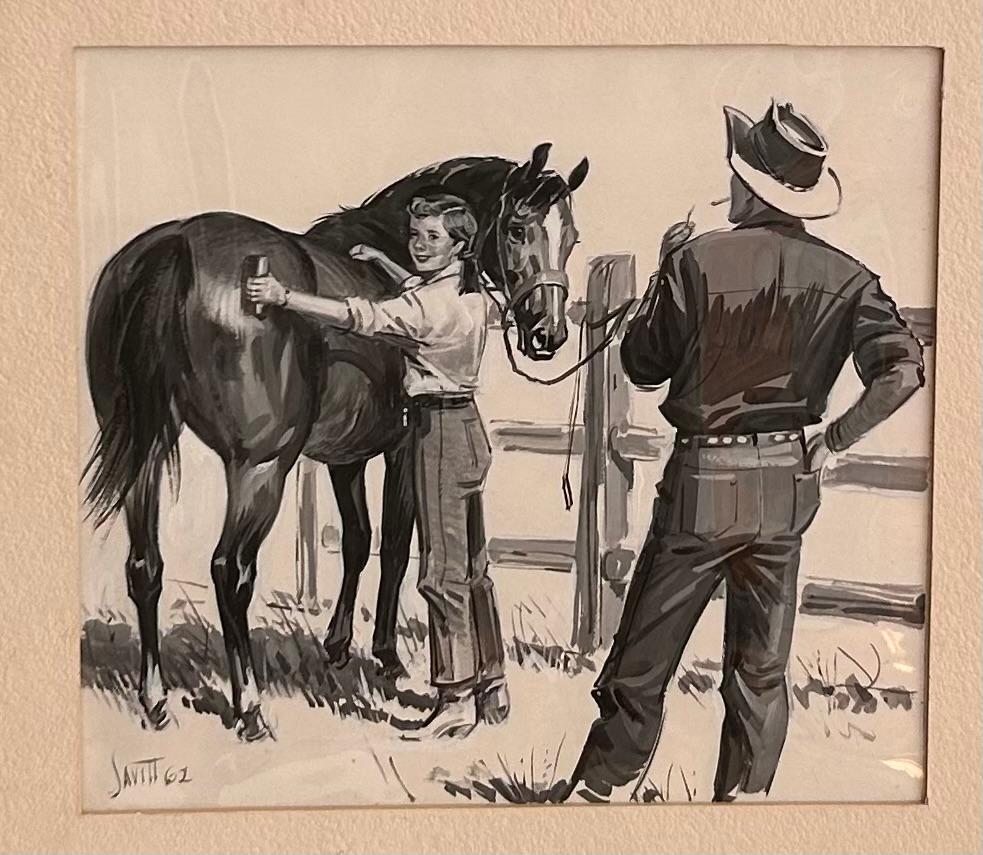 This 1962 pen and ink drawing, which exemplifies a vintage style of art, was created for “Horse in Her Heart,” a book by Patsy Gray. The drawing is protected by a layer of clear plastic and a cardboard mat, which should both be discarded. The image measures 8 by 8 inches. (SOLD) 1/25