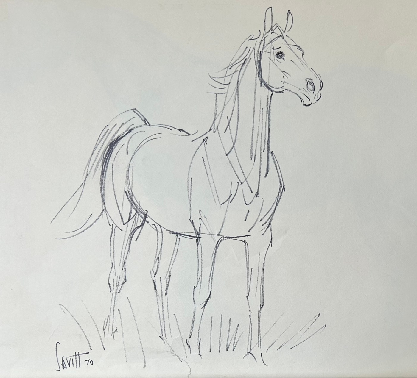Created in 1970 with a minimum number of lines, this ink sketch effectively captures the likeness of a horse. The paper has some damage but not enough to detract from the art. This sketch measures 13 by 16 inches on heavy paper and has neither a frame nor a mat. (sold)