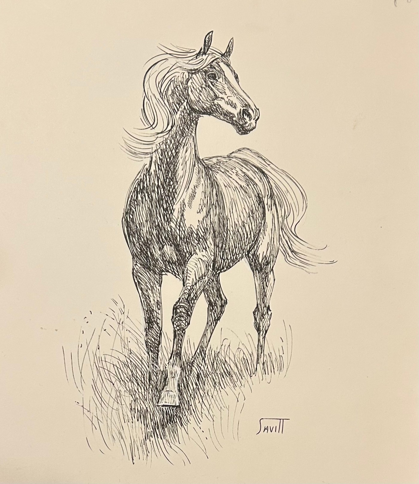 This pen and ink drawing on medium weight paper, is a classic example of Sam Savitt’s style of drawing horses. It measures 11 by 9 inches and does not have a mat or frame.