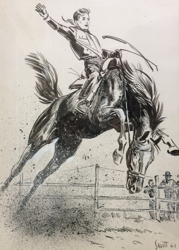 The drawing in black ink shows a rider sailing towards earth after having been tossed by a horse he was trying to break. This drawing on paper measures 14 by 10 inches and has neither a frame nor a mat.