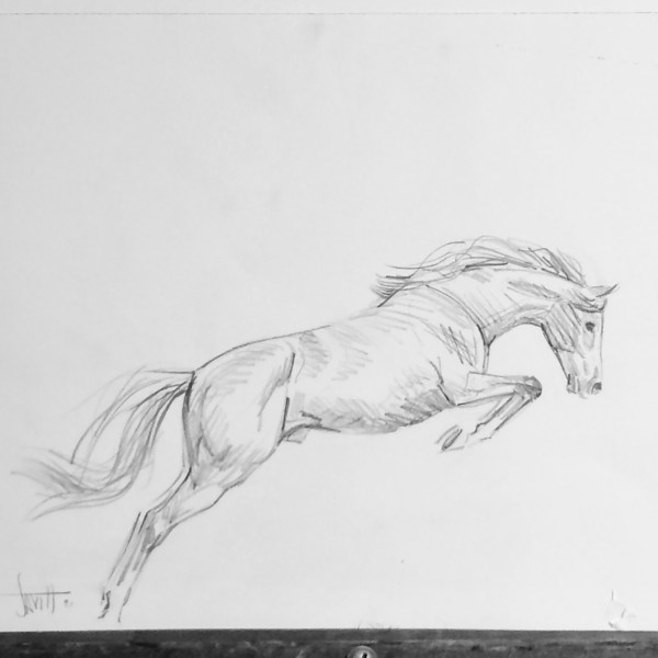 This simple but graceful pencil drawing captures the mastery of equestrian form for which Sam Savitt was well known. Drawn on heavy stock paper, this piece measures 11 by 14 inches. There is slight damage to the top and bottom edges of the paper, but these are immaterial to the drawing itself.