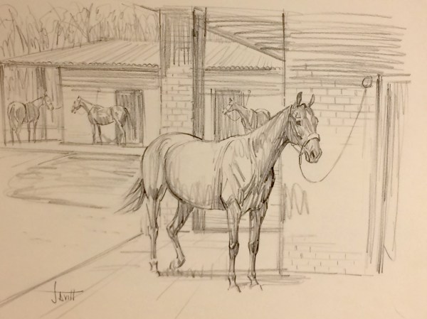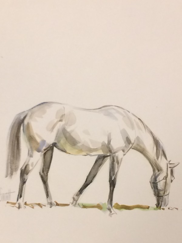 In this simple scene of horse waiting to be untied, Sam Savitt relies on a an economy of pencil strokes to capture this scene. The drawing on heavy paper measures 14 by 17 inches. (sold)