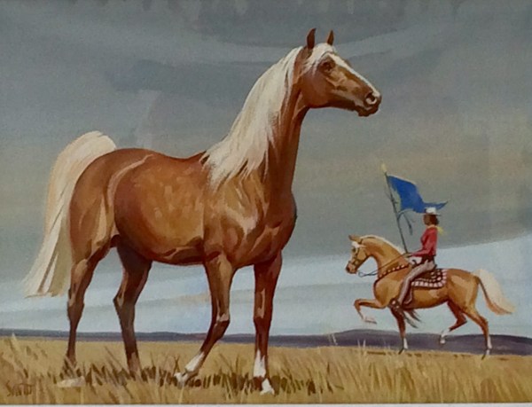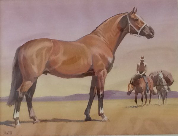 This portrait is one of a series created for the 1962 book “Around the World with Horses,” by Sam Savitt. The image of this painting was later used for print reproductions. Painted in gouache, this piece is framed under clear plastic with a simple white mat. For that reason, the painting itself is in excellent condition. The mat measures 14.5 by 16 inches. The image itself is 8 by 11 inches. Price: $875. (SOLD)