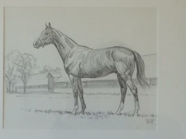 This is one of a series of drawings of specific horses being shown in a catalog for the 1974 Saratoga yearling sales. This pencil drawing is on paper, measuring 8 by 13 inches inches, and has publisher’s notes in the bottom margin. (Copy of catalog page would be provided with artwork.) Price: $375 (sold)
