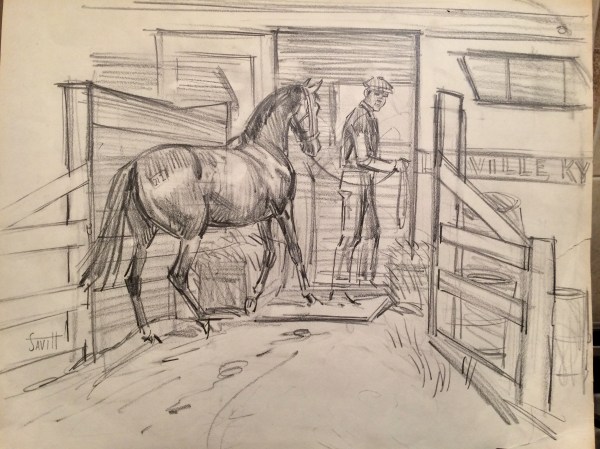This well-defined sketch of a horse being loaded into a trailer has slight damage — a ripple and slight tear in the lower right-hand corner. But it’s pretty minor stuff. The drawing measures 13.5 by 16.5 inches. Price $250. (Sold)