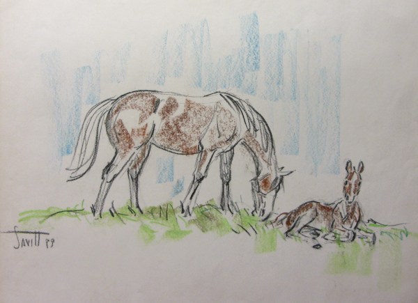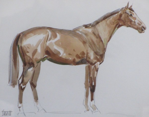 This watercolor, painted in 1978, is all about the anticipation of taking a jump in competition. Framed in a white mat with light brown inset, this piece measures 18 by 19 inches.