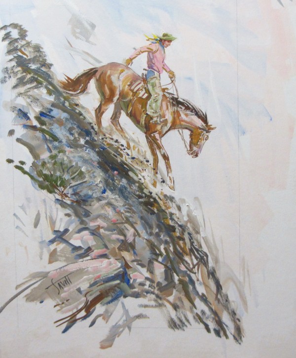 There’s some rough landscape in the west and sometimes horse and rider have to deal with it as best they can. This painting, which done in gouache on a board, measures 15 by 20 inches and has no frame or mat. Price: $1,500. (sold)