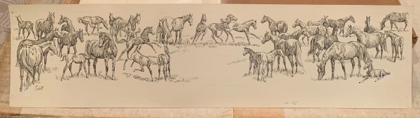 The Kellogg Arabian ranch in California was the scene of this exquisite drawing, which measures 10 by 14 inches. Rendered in pencil, this drawing truly showcases Sam Savitt’s enormous skill at creating live action with the simplest of mediums. (SOLD)