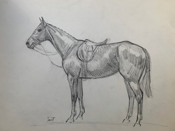 This original portrait of a horse in full riding gear shows off Sam Savitt’s skill at rendering perfectly proportioned likenesses of the horse. This drawing on paper that measures 13 by 16 inches was probably completed in the 1960s. Price $300. (SOLD)