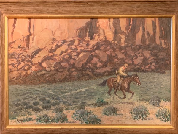 Completed during the last decade of his life, Sam Savitt depicts the inherent loneliness of the Pony Express rider in this expansive oil painting (42 by 30 inches). While the Pony Express mail delivery service lasted only 18 months (1860-61), it is ingrained in the lore of the American West and represents the country’s first transcontinental communications system. This is the largest piece of artwork in our collection. (SOLD)