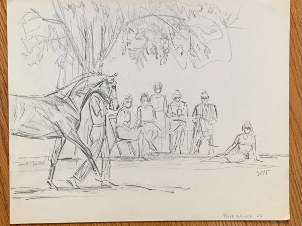 This sketch in charcoal pencil was drawn on-site at a thoroughbred horse breeding farm in Maryland in 1965. Sam Savitt often preferred these quick sketches over photography when preparing for a future drawing or painting. This drawing on medium-stock paper measures 13 by 17 inches — the dimensions of his sketch pad.