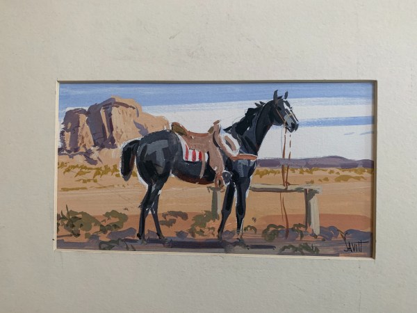 This watercolor is classic Savitt — a relatively simple treatment that displays rodeo riding with energy and accuracy. This artwork measures 14 by 14 inches on a very paper stock (perhaps light cardboard). It has no mat or frame. (Sold)